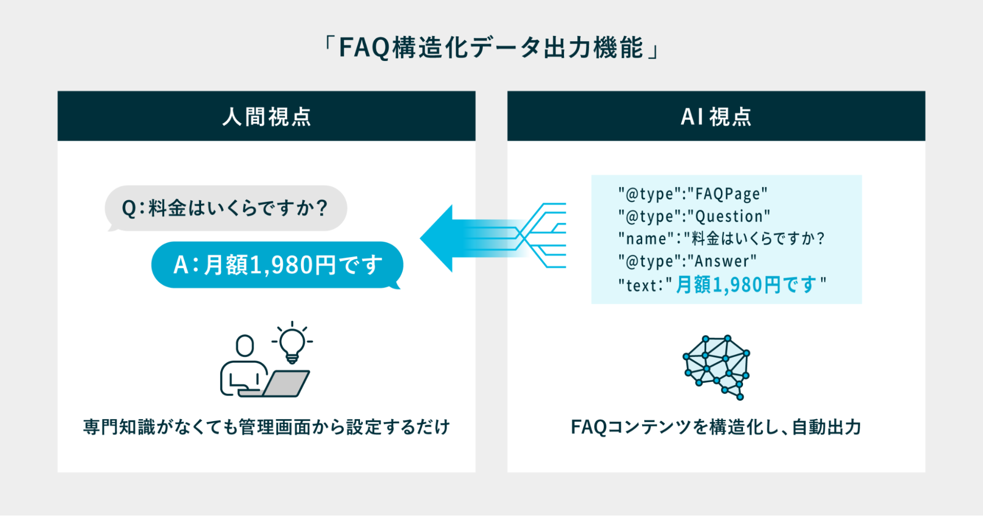 本機能は、各企業やサービスが保有するFAQコンテンツを、生成AIや検索エンジンが優先的に参照するための「構造化データ(Schema.org形式)」として自動出力するものです。当該分野に詳しくない人でも管理画面から設定するだけで、ページ内のどの部分が「質問」で、どこが「公式な回答」であるかを、AIが瞬時に正確に判別できるようになります。